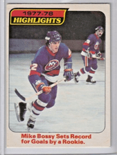 But let’s dig a little deeper. It is important to note that there is a difference between rookie card and rookie year. For instance, Mike Bossy, whose rookie card #115 is from the 1977-78 year also had a “Highlights” card # 1, where he featured for breaking the rookie scoring record.