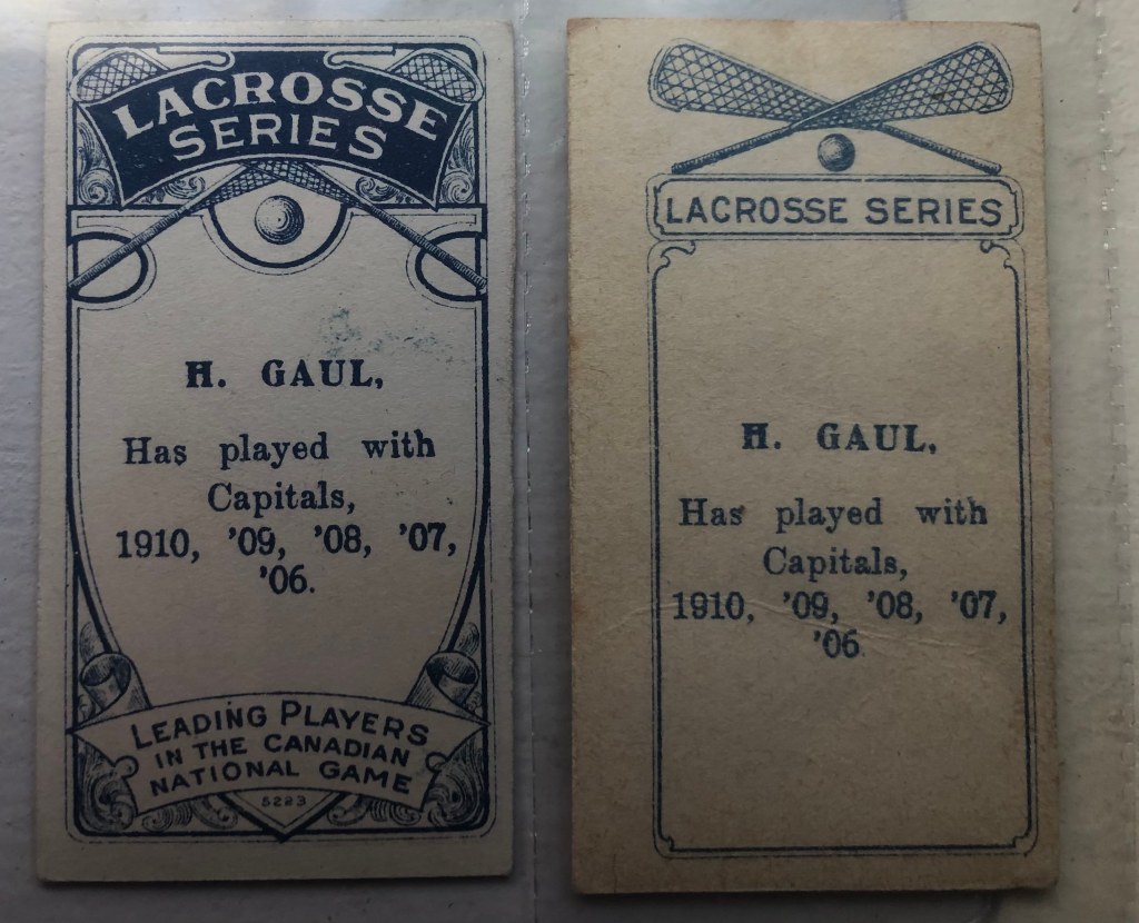 The same situation occurs in the C60 and C59 Lacrosse series issued by imperial Canada. The pictures on the front are virtually identical but have different backs. In both cases, most collectors would agree that the older of the two sets is the true rookie card.