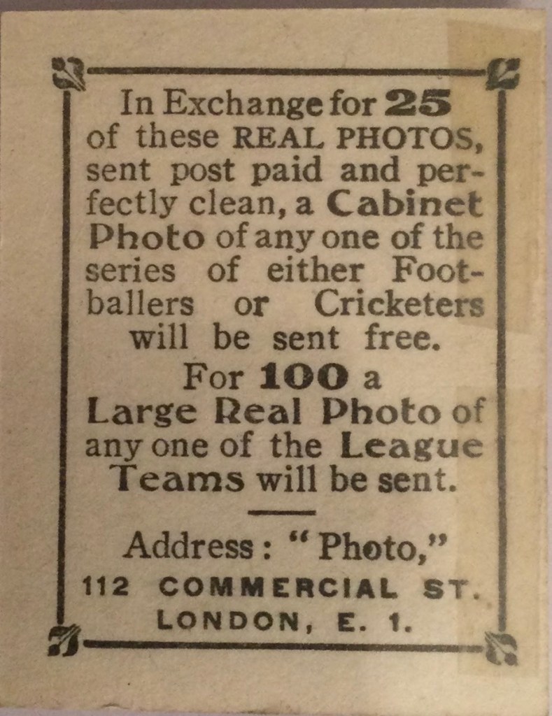 Like Scott, Middelboe’s first card was likely in the autumn of 1921 showing him with Chelsea. Interestingly Middelboe had a second card released (but with the same number) later in the series. Middelboe is shown playing with Casuals which it is thought he joined around 1923 making this card a later version.