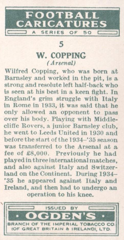 Wilf Copping is known for being one of the hardest players ever to play the game. He was a solid left and center half at Leeds, then Arsenal and back to Leeds.