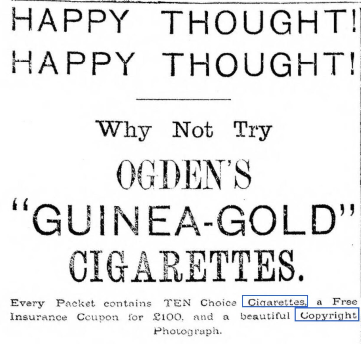 Ogden’s provided a “photo” with their cigarettes as early as September 1894. However, through 1895 and most of 1896 Ogden’s stopped advertising a photograph with the packets. A new advertising campaign in late August of 1896 “copyright photograph” as well as train insurance coupon.