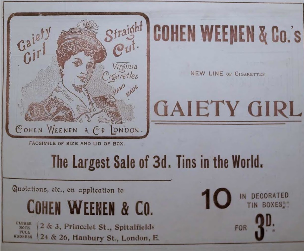 In the mid-1890s, cigarette manufacturers were competing to gain a hold of the female market. As such, many brands directed their offerings towards women. Cohen Weenen & Co. launched a brand called Gaiety Girl after the Gaiety Theatre London in 1896. As the name implies a gaiety girl was a girl out to have fun, socialize and of course, smoke cigarettes.