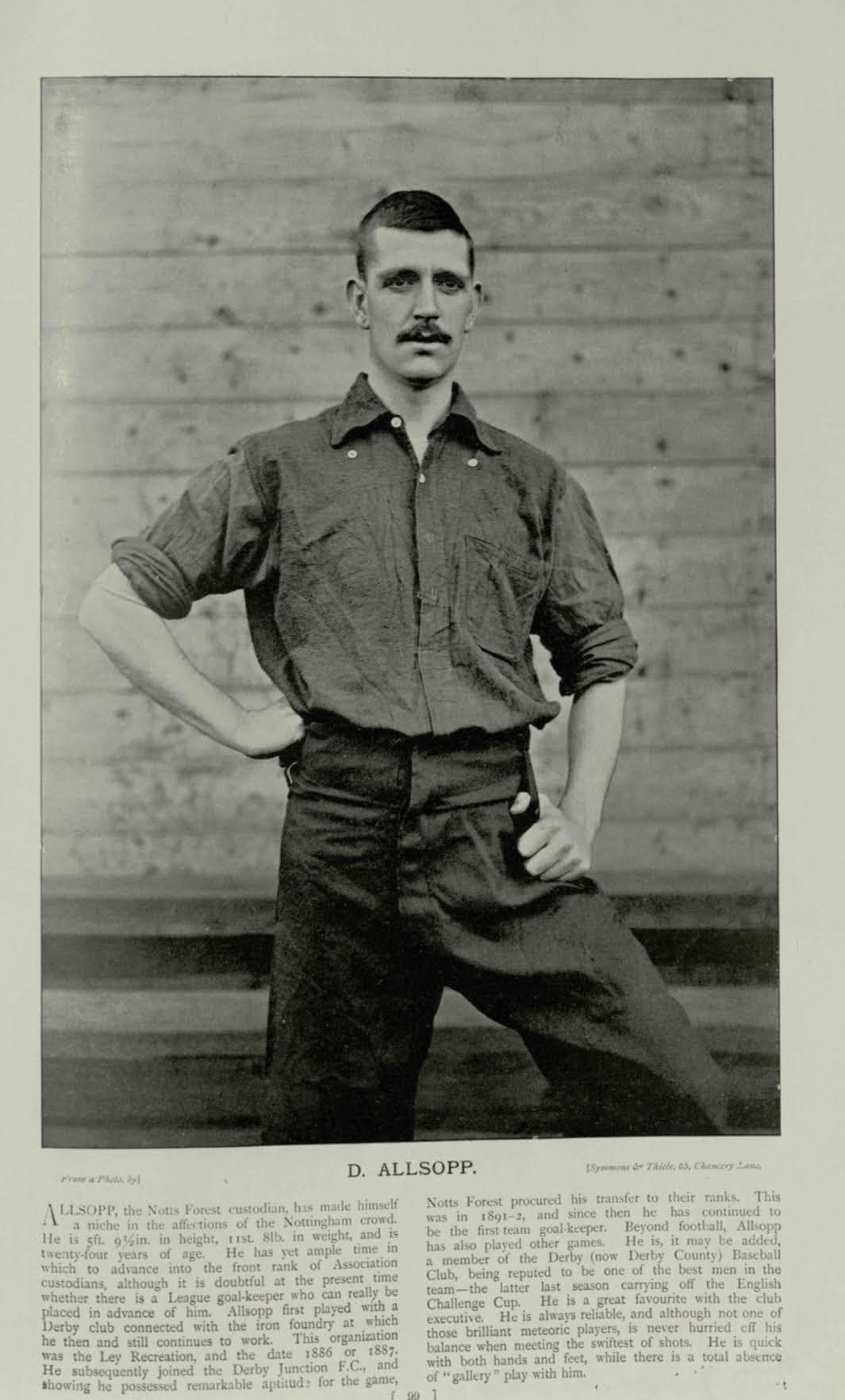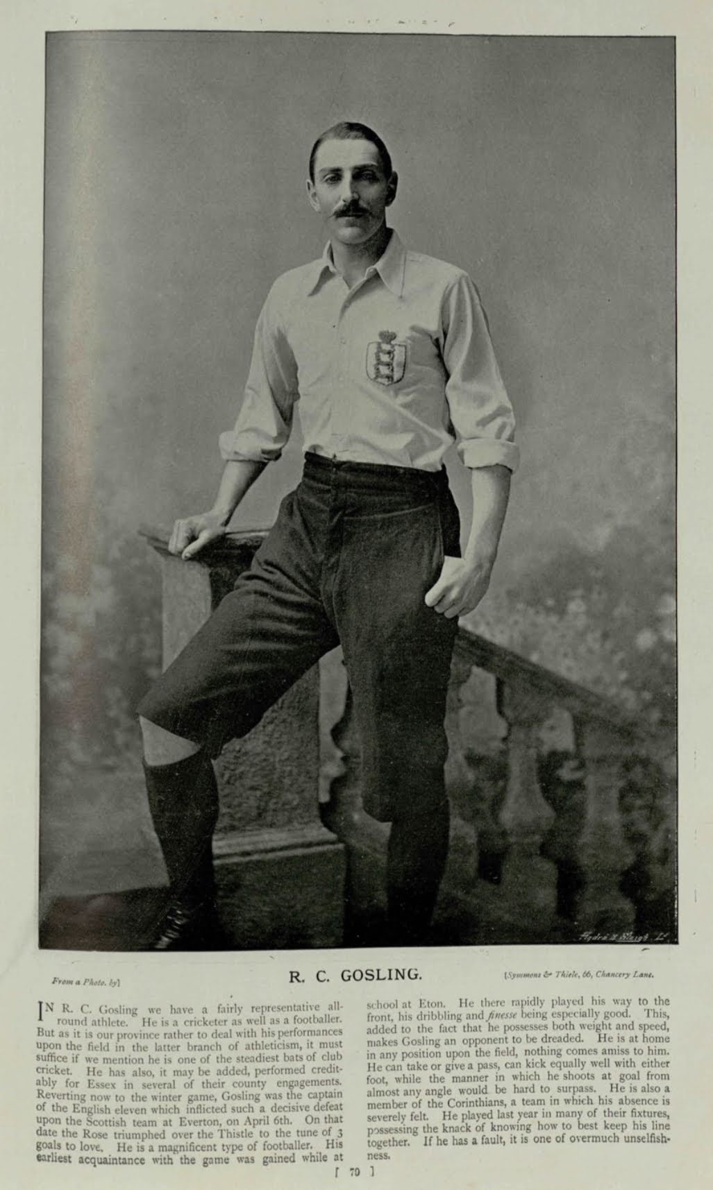 Symmons and Thiele were established in 1894 and specialized in photography of sports and sports teams. Many of the photographs of the footballers are easily identified as Symmons and Thiele as they used similar backgrounds and settings. Symmons and Thiele became press photographers and their photos can be found in Sportfolio, the Sketch and Boys Own Paper and multiple others that were released in 1895. However, the partnership dissolved in May 1896 and Reinhold Thiele continued producing photographs on his own after this date. Along with magazines and newspapers, Symmons and Thiele licensed their copyright photos to different cigarette card manufacturers including Ogden’s and Cohen Weenen & Co.