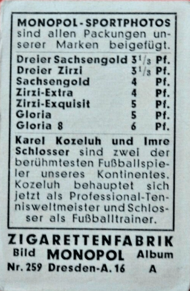 1932 Monopol Zigarettenfabrik, Dresden Sportphoto Album – Card #259. Kozeluh u. Schlosser